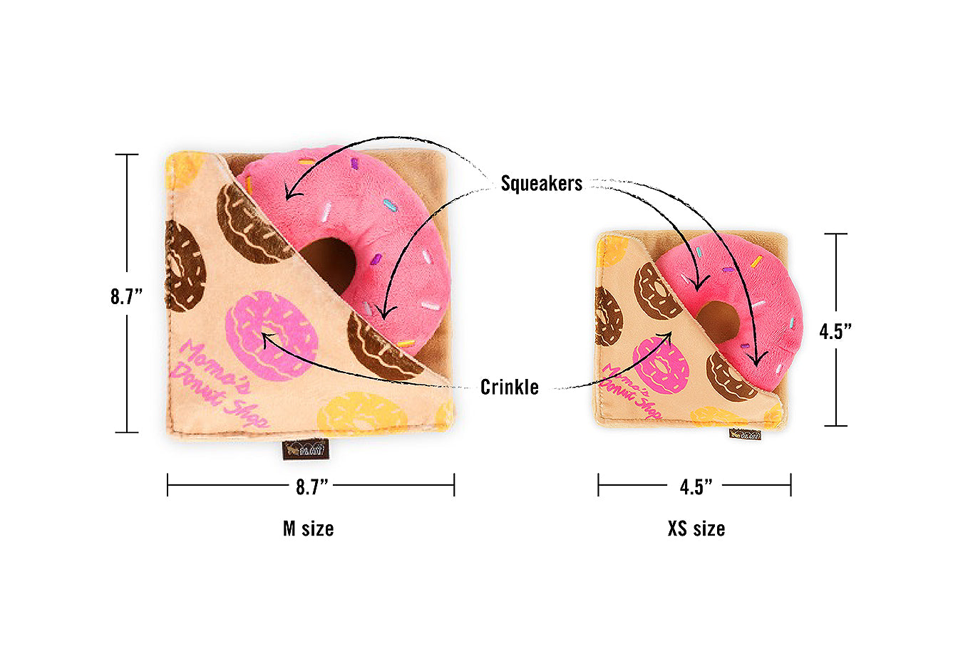 Satisfy your pup's sweet tooth with P.L.A.Y.'s Pup Cup Café Doughboy Donut toy! Available in two sizes, this pink confection features two squeakers in the doughnut's body for double the fun and a detachable crinkle sleeve for an extra layer of texture during playtime. Treat your dog to the sweetness of the perfect pastry!