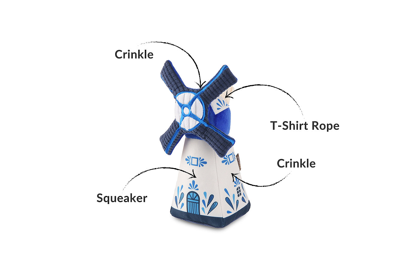 Let furry friends embark on an exciting playtime adventure, imagining themselves running through the lush, grassy fields of the Netherlands with P.L.A.Y.’s Totally Touristy Dutch Windmill! Available in two sizes—medium and extra-small—with the same engaging features, pups of all sizes can enjoy the thrill of the European breeze rustling through their fur as they tug, squeak and crinkle this iconic Dutch-inspired windmill toy.